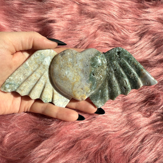 Stunning High Quality Moss Agate Heart with Wings Carving INCLUDES STAND