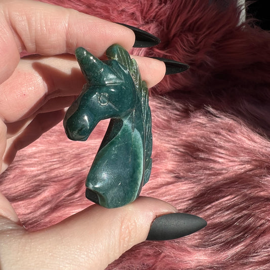 Stunning High Quality Moss Agate Unicorn Carving - D